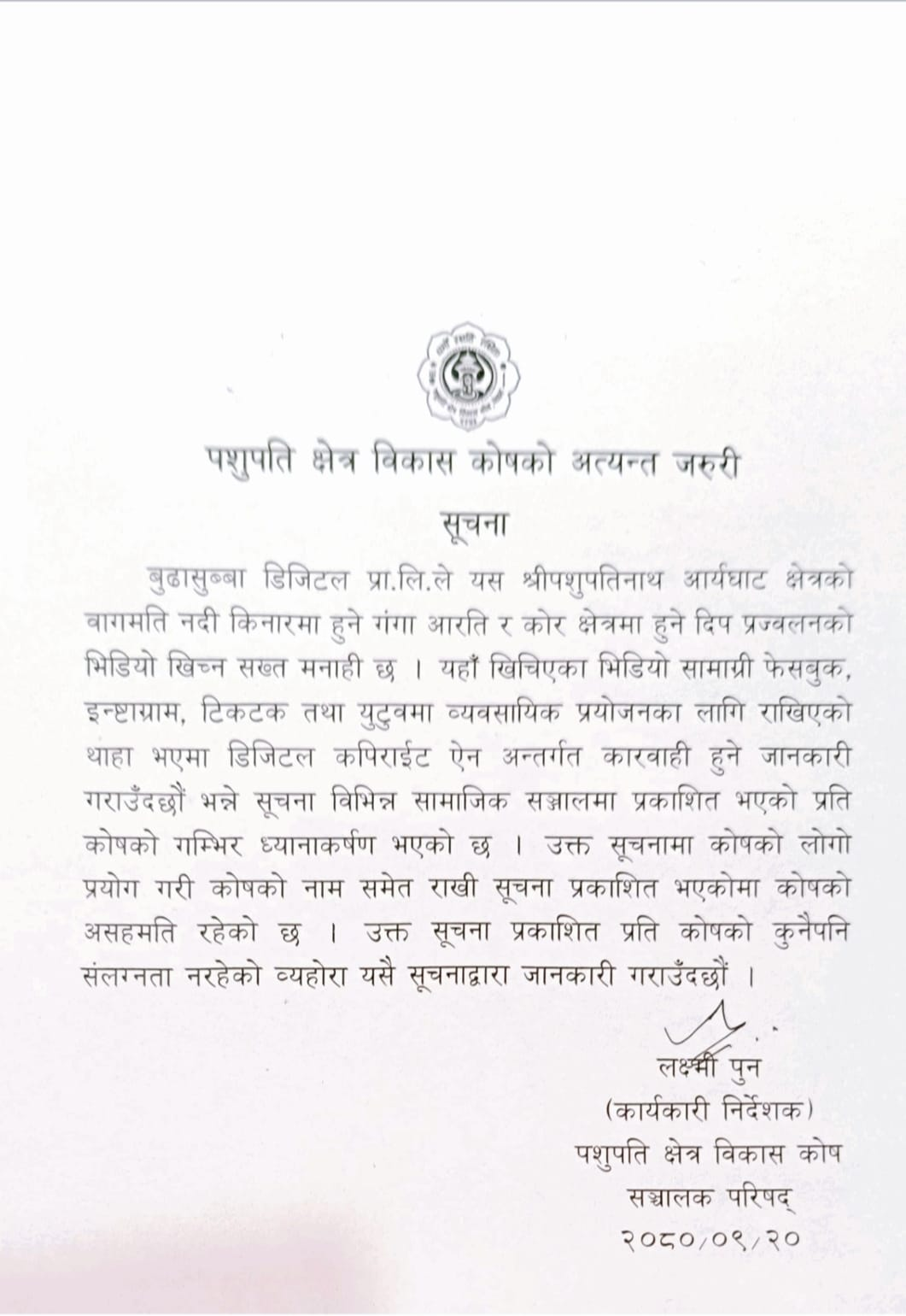 काठमाडाैं । पशुपति क्षेत्र विकास कोषले बुढासुब्बा डिजिटल प्रालिसँग सम्झौता भएको भनिएको विषयमा आपत्ति जनाएको छ। कोषले शुक्रबार एक सूचना जारी गर्दै गंगा आरती र दीप प्रज्ज्वलनको भिडियो खिच्ने विषयमा सामाजिक सञ्जालमा आएका सूचनामा सत्यता नरहेको प्रस्टीकरण दिएको हो।