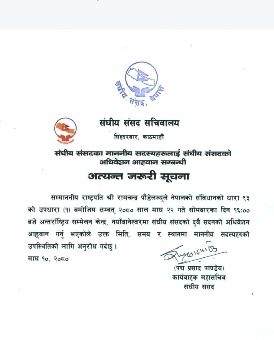 मंगलबारको मन्त्रिपरिषद् बैठकले संविधानको धारा ९३ को उपधारा ९१० अनुसार राष्ट्रपति समक्ष अधिवेशन आह्वानका लागि सिफारीस गरेको थियो । यस आधारमा बैठक माघ २२ गते सोमबार दिँउसो ४ बजे संसदको बैठक बस्नेछ । यससँगै संसद् सचिवालयले सांसद्लाइ पत्राचार गरेकाे छ ।