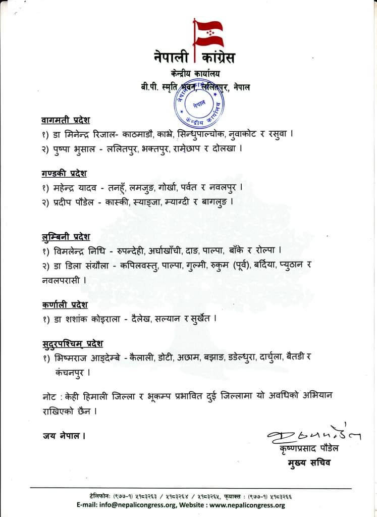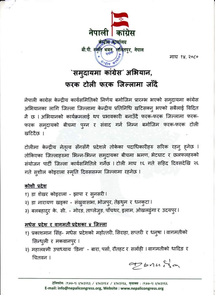 काठमाडाैं । नेपाली काग्रेस केन्द्रीय कार्यसमितिको निर्णय बमोजिम प्रारम्भ भएको समुदायमा कांग्रेस अभियानका लागि जिल्ला जिल्लामा केन्द्रीय प्रतिनिधि खटिसक्नु भएको सबैलाई विदित नै छ l अभियानको कार्यक्रमलाई थप प्रभावकारी बनाउँदै फरक-फरक जिल्लामा फरक-फरक समुदायको बीचमा पुग्न र संवाद गर्न निम्न बमोजिम फरक-फरक टोली खटिदैछ ।