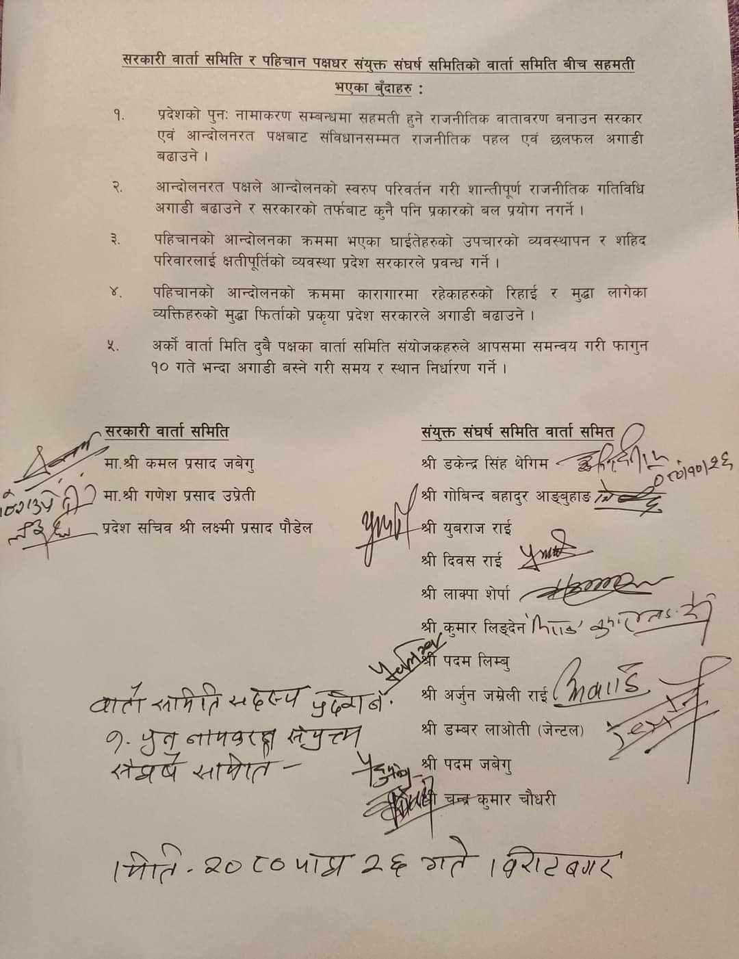 सहमतिमा पहिचान पक्षले निषेधको आन्दोलन फिर्ता लिएर शान्तिपूर्ण आन्दोलन गर्ने, आन्दोलनमा घाइते भएका आन्दोलनकारीको प्रदेश सरकारले निःशुल्क उपचार गर्ने, उनीहरूमाथि लगाइएका राजनीतिक मुद्दा प्रदेश सरकारले फिर्ता लिने र फागुन १० गते पहिला नै दुवै पक्षको सहमतिमा पुनः वार्ताको मिति तोक्ने सहमति भएको हाे ।