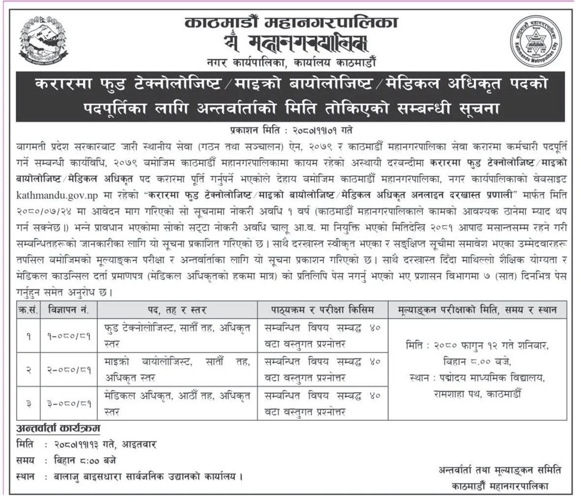 काठमाडौँ । काठमाडौँ महानगरपालिकाले फुड टेक्नोलोजिष्ट, माइक्रो बायोलोजिष्ट र मेडिकल अधिकृत पदका लागि आवेदन मागेको छ ।