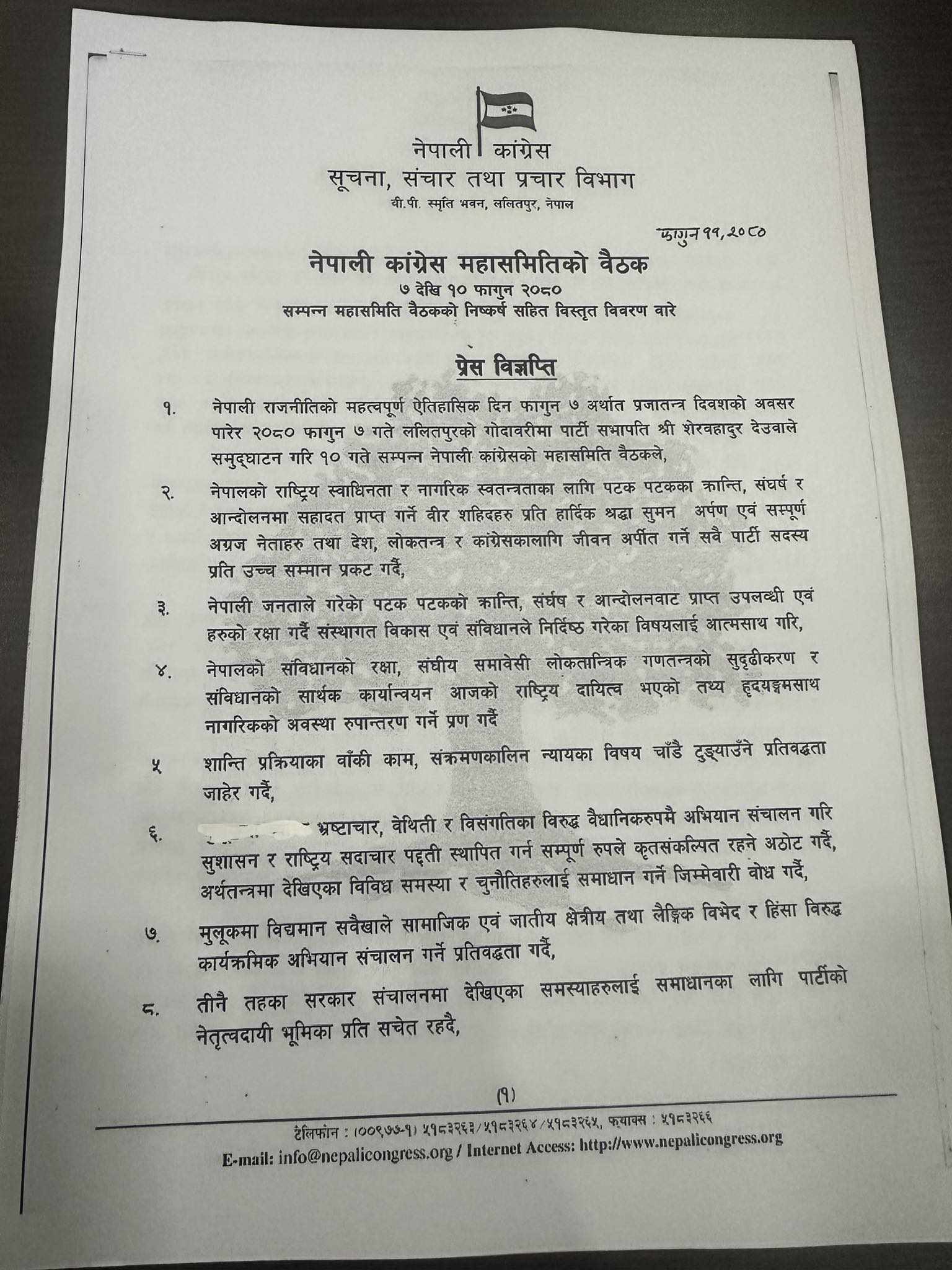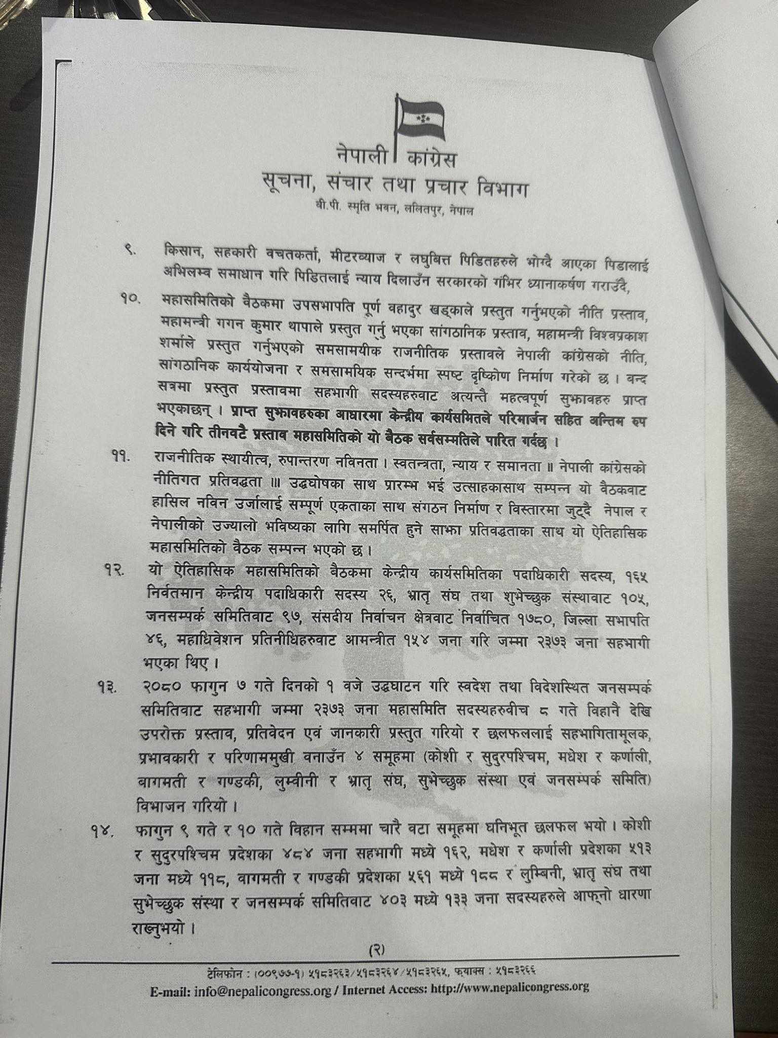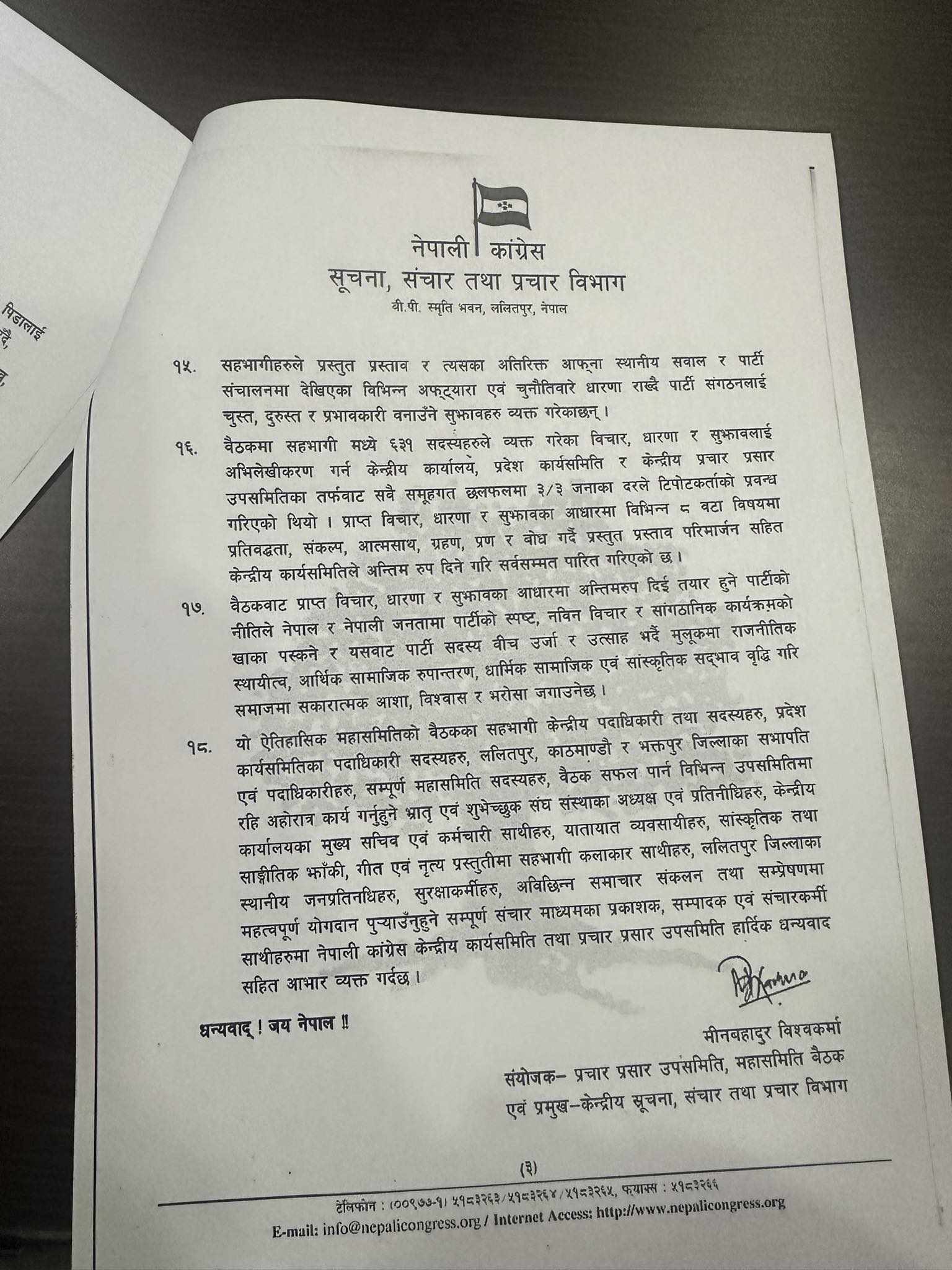 काठमाडाैं । कांग्रेस महासमिति बैठकमा २३ सय ७३ जना महासमिति सदस्य सहभागी भएका छन् । पत्रकार सम्मेलन गरी कांग्रेसले यसबारे जानकारी दिएकाे हाे।