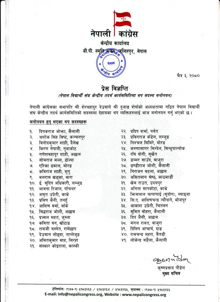 काठमाडौं । नेपाल विद्यार्थी संघको तदर्थ समितिमा ४१ जना थप भएका छन् । यसअघि ७११ सदस्यीय रहेको नेविसंघको तदर्थ समितिमा ४१ जना थप भएका हुन् । नेपाली कांग्रेसका सभापति शेरबहादुर देउवाले दुजाङ शेर्पाको अध्यक्षतामा गठित नेविसंघको केन्द्रीय तर्थ समितिमा विभिन्न जिल्लाका गरी ४१ जना थप गरेका कांग्रेस पार्टी कार्यालयका मुख्य सचिव कृष्णप्रसाद पौडेलले जानकारी दिए ।